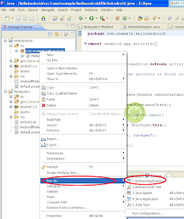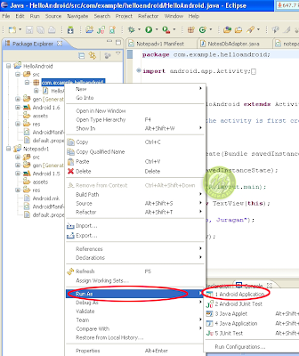 Plugin Eclipse akan secara otomatis membuat konfigurasi untuk proyek anda dan menjalankan Emulator Android. Emulator biasanya butuh waktu beberapa menit untuk booting, untuk kasus saya, android memerlukan waktu booting sekitar 4 menit sebelum menampilkan “Hello World” di layar, saya sendiri telah merubah beberapa kode nya menjadi hello juragan.